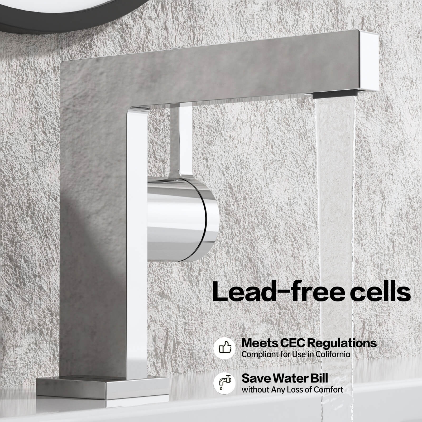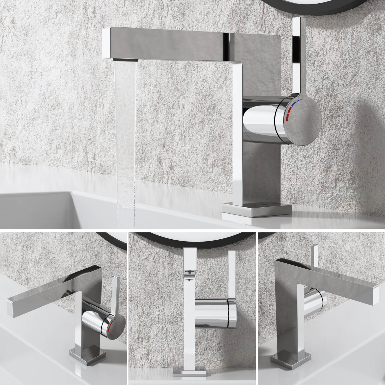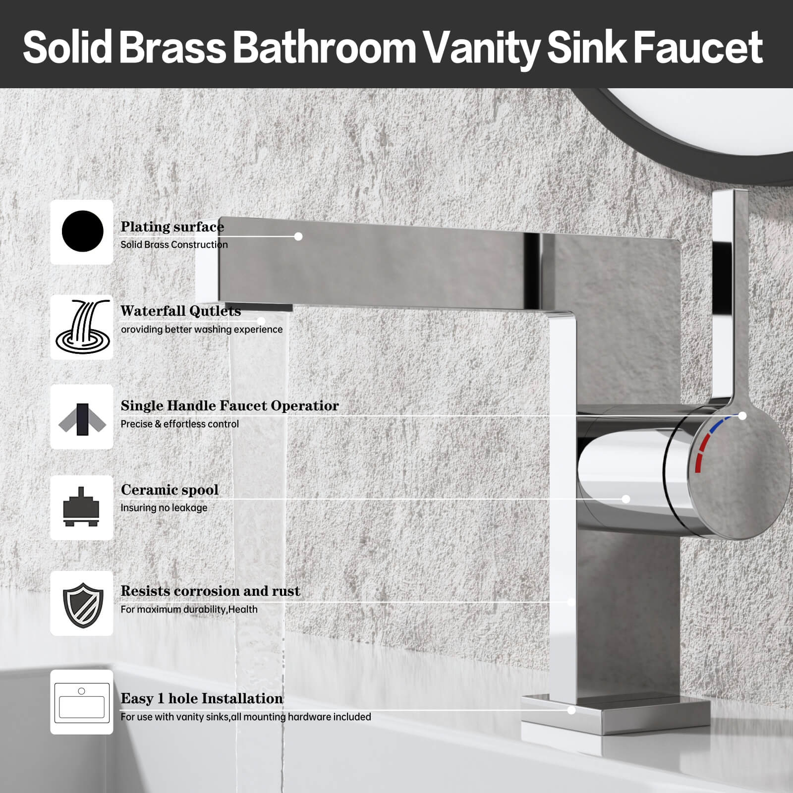 This square-shaped basin faucet, with its sleek and modern look, perfectly fits into contemporary bathrooms. Crafted from high-quality brass and finished with precise electroplating, it offers excellent corrosion resistance and durability. The 90° rotatable single-handle design makes it effortless to control hot and cold water. The waterfall outlet provides a smooth, natural flow, enhancing the overall experience. The ceramic valve core, tested for over 500,000 cycles, ensures leak-proof and long-lasting performance.